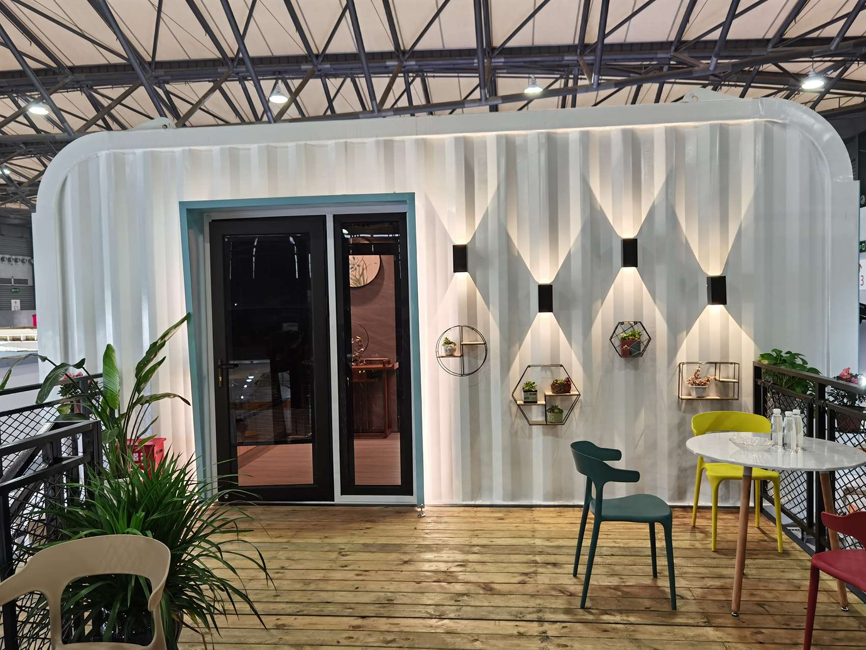 柜族本次參展的產(chǎn)品——逸海小筑位于E2裝配式建筑展區(qū)的2269展位,是一款以藍(lán)白為主色調(diào)、融入了水與波浪元素的海洋風(fēng)集裝箱別墅。該產(chǎn)品的設(shè)計(jì)理念為環(huán)保、舒適、旅居,以不破壞場(chǎng)地與自然環(huán)境為出發(fā)點(diǎn),整個(gè)產(chǎn)品為工廠預(yù)制完成,地面抬高3個(gè)臺(tái)階,有效隔離了地面的潮氣。箱子著力點(diǎn)有圓柱支撐,底座圓盤加大了受力面積和整體平衡性。箱子整體分為一、二層兩個(gè)模塊,用吊機(jī)和平板車整體裝卸運(yùn)輸,在選好的平整地面直接擺放就可以入住使用了。