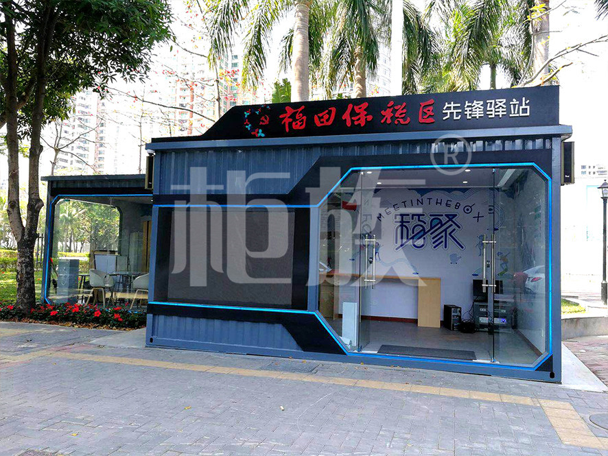 驛站使用兩個(gè)集裝箱錯(cuò)位串聯(lián)而成,正面墻體使用大面積玻璃門窗,線條流暢、造型時(shí)尚、通透亮堂,很好的突出了驛站的標(biāo)志性與開放性的特點(diǎn)。